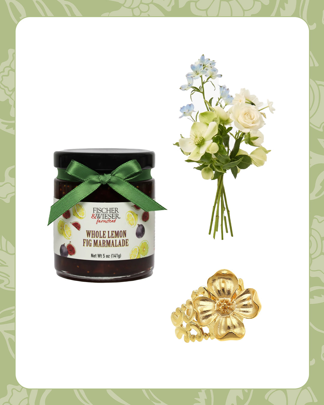 Thoughtful little luxuries make the sweetest host gifts for spring gatherings. The Dogwood Ring, new to Susan Shaw this season, adds a touch of nature-inspired charm, while bright Lemon Marmalade offers a taste of the season. Send guests home with a small bundle of florals from your table arrangements for a simple, thoughtful finishing touch.