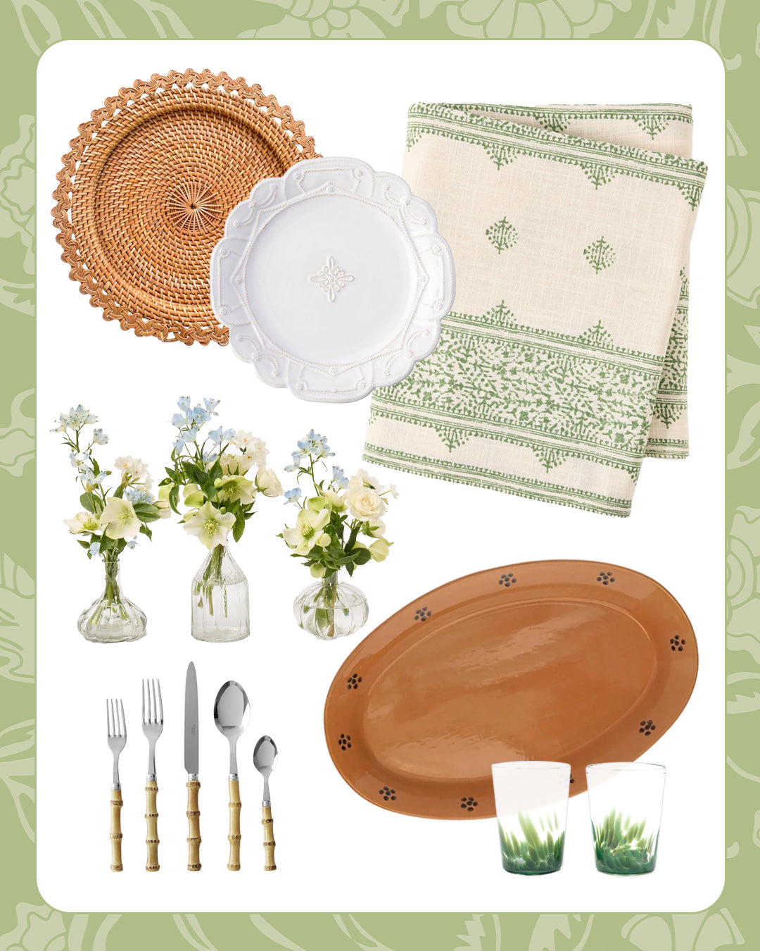 Natural textures and fresh greenery bring an effortless charm to outdoor dining. Layer woven elements with classic white serving pieces for a table that feels relaxed yet refined. This terracotta platter adds warmth and character, while simple glassware and fresh florals keep the setting light and inviting.