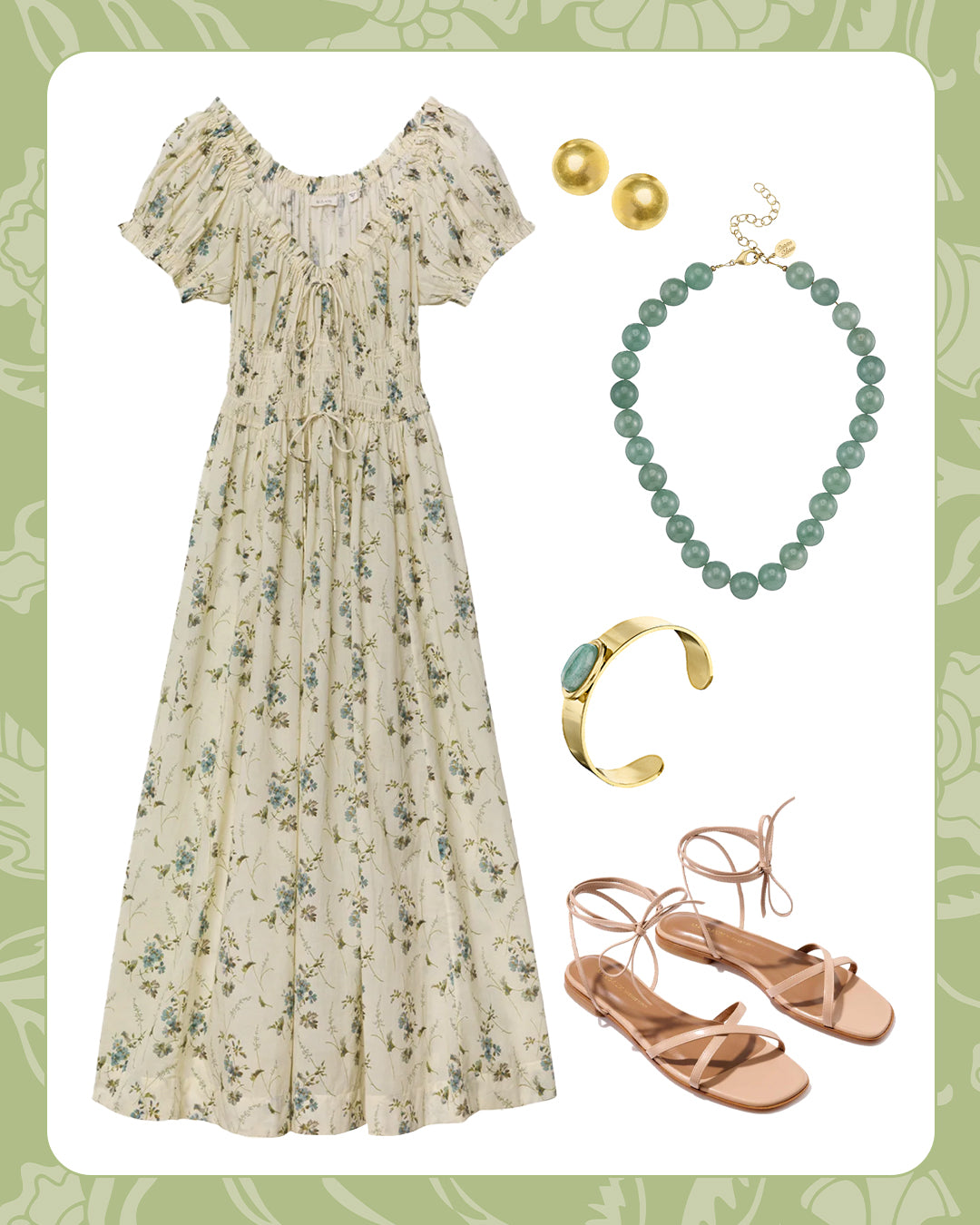 Easy silhouettes and natural textures capture the relaxed elegance of al fresco dining. Soft florals and light layers feel effortless yet polished, perfect for lingering lunches or golden hour gatherings outdoors. This floral dress sets a romantic tone, while simple accessories and delicate sandals keep the look refined and comfortable for dining under the open sky.