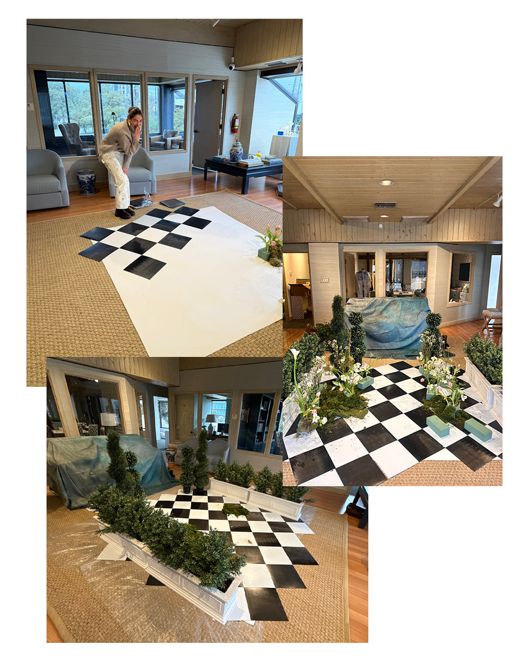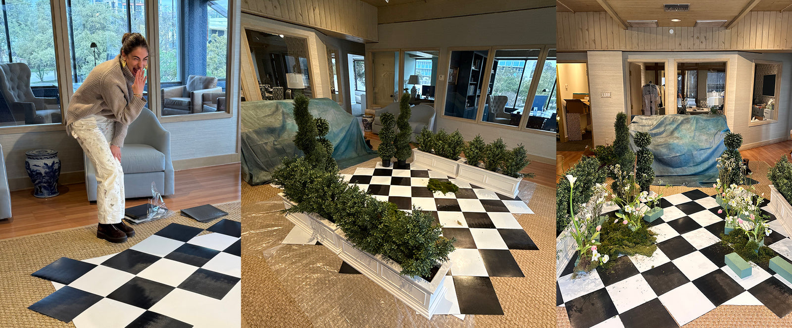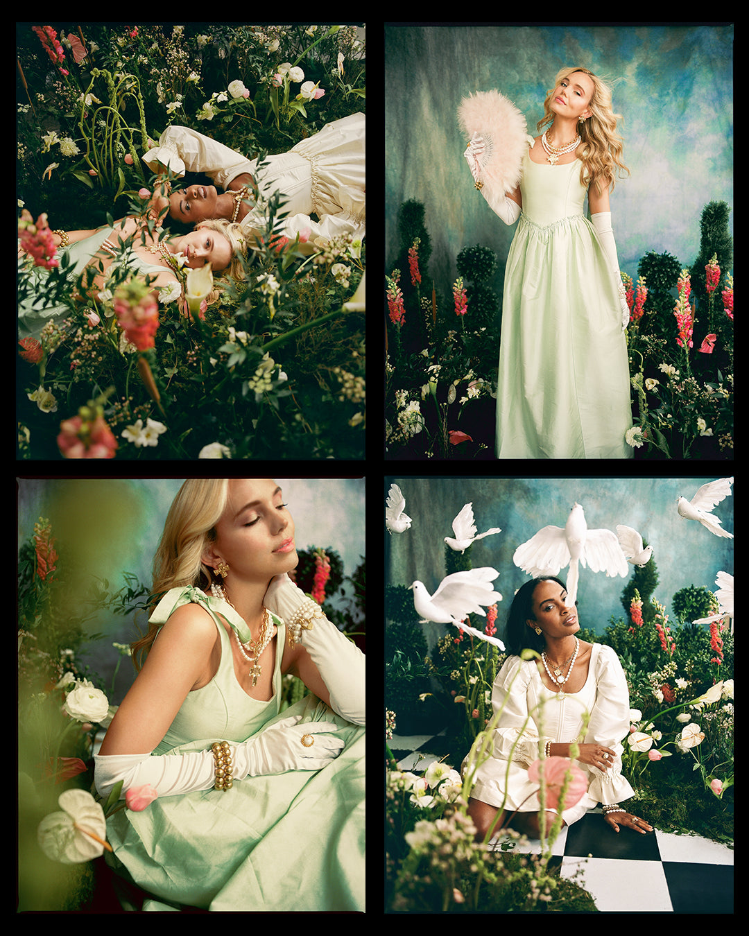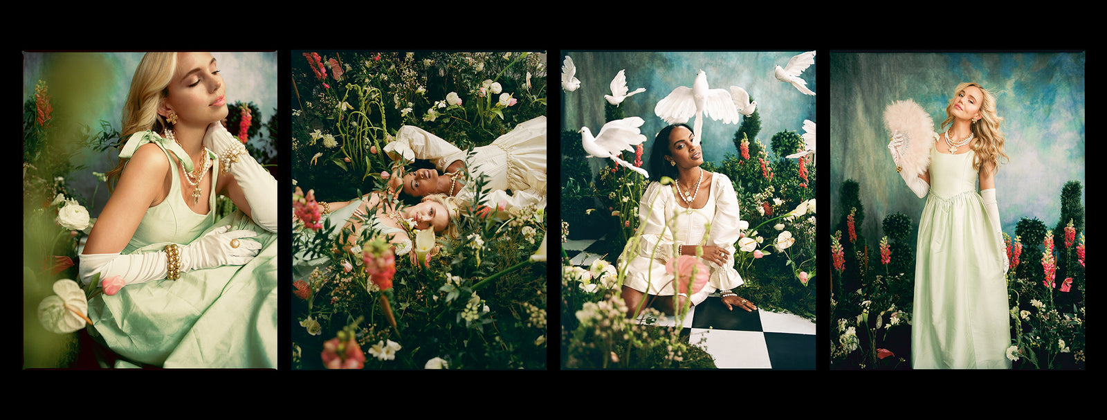 So, we set to work building our own secret garden backdrop right in the middle of our Susan Shaw HQ. We constructed a faux checkered marble floor using peel-and-stick tiles, and made dozens of arrangements in floral foam using stems from a variety of local flower shops. With only hours left before our models and talent arrived on set, we worked together to pivot — and the end result was more magical than we ever could have imagined.