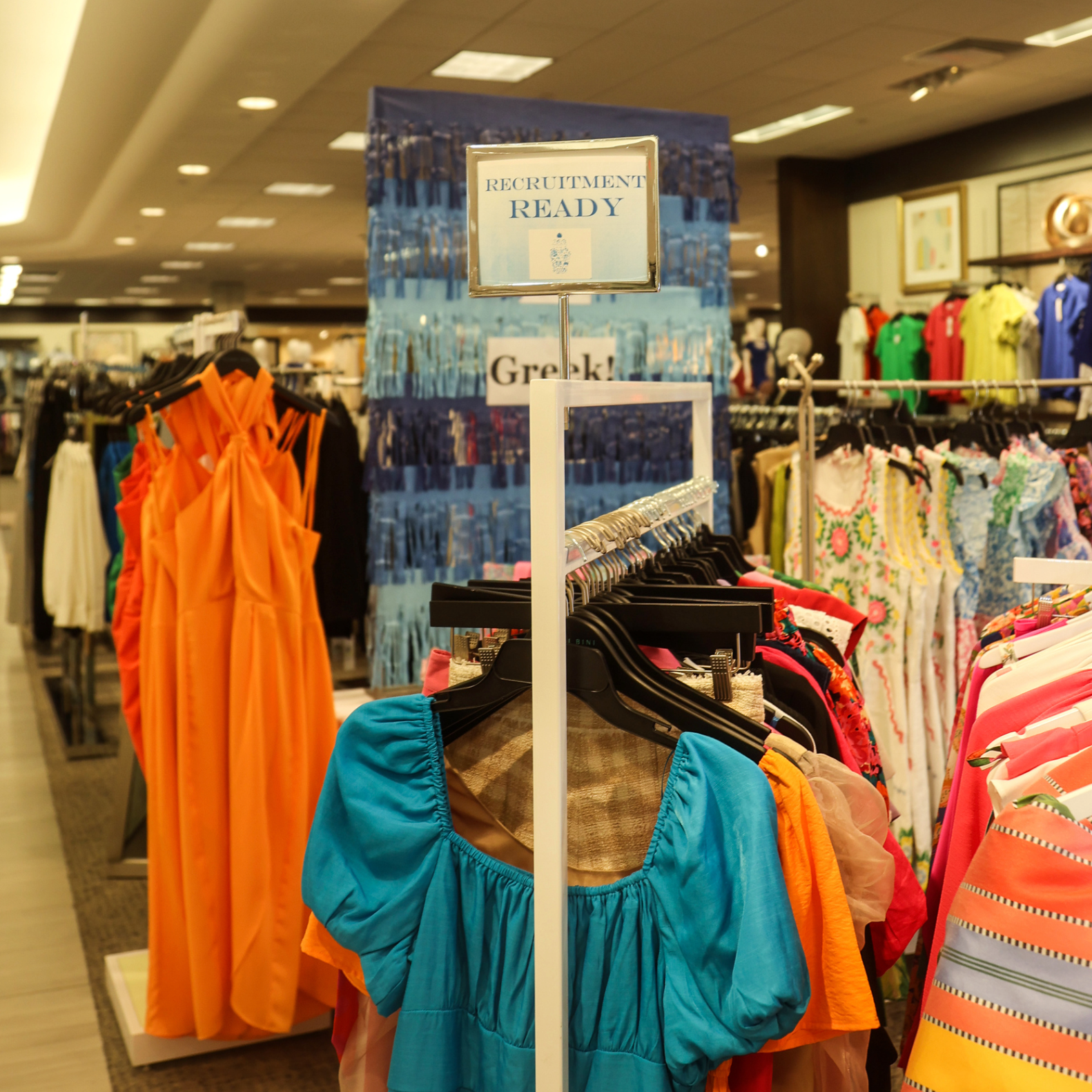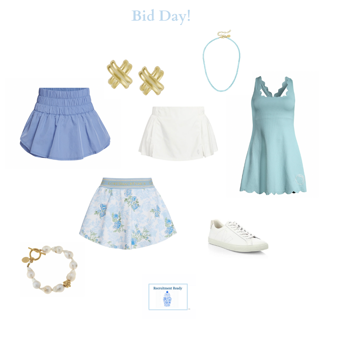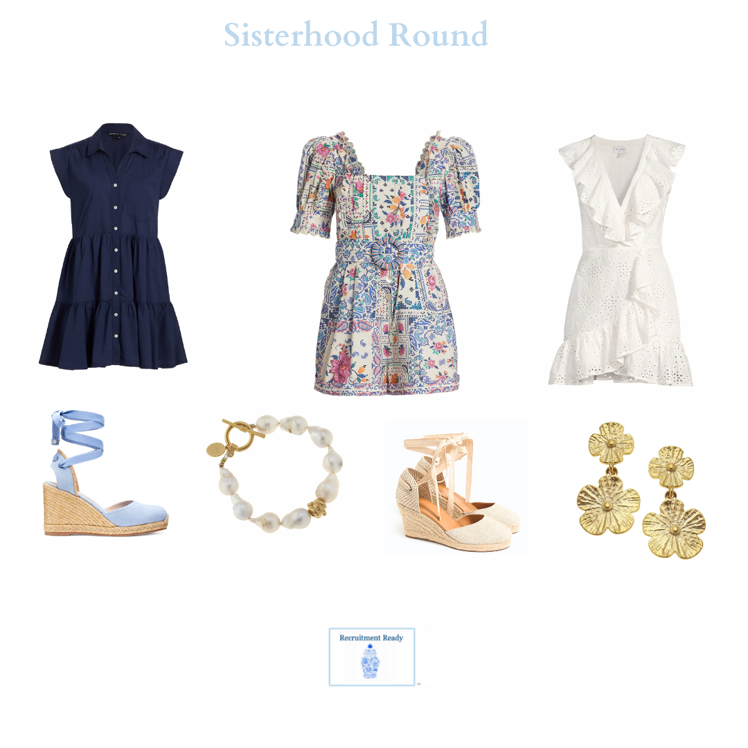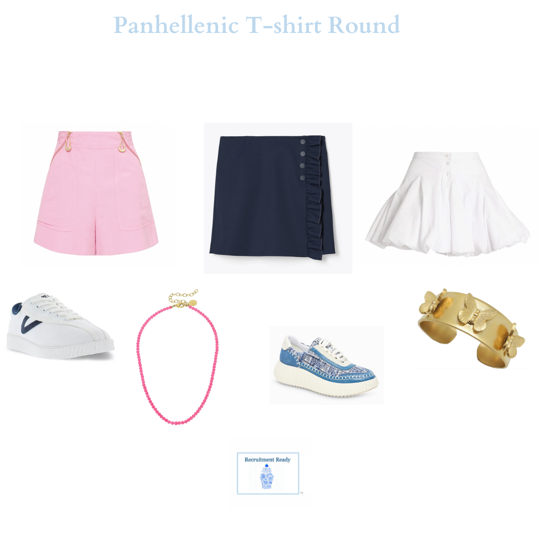 LN: “I always recommend girls dress themselves in a way they feel cute, classy, and confident. That’s always the goal. I truly believe that confident girls can do anything, and they’re going to have a better recruitment if they’re wearing something they feel confident in. It varies on school depending on what to wear specifically, but we do a lot of sun dresses, a lot of bold colors, and fun patterns. A lot of schools also require a Panhellenic t-shirt round, so I help girls make a t-shirt look cute – I am a big fan of the structured front tuck for that. That being said, I do encourage girls to pick patterns and styles that make them feel most like themselves and remind them they don’t have to be someone that they’re not to get into a sorority. And you have to accessorize accordingly! Of course, Susan Shaw is the best for that.”