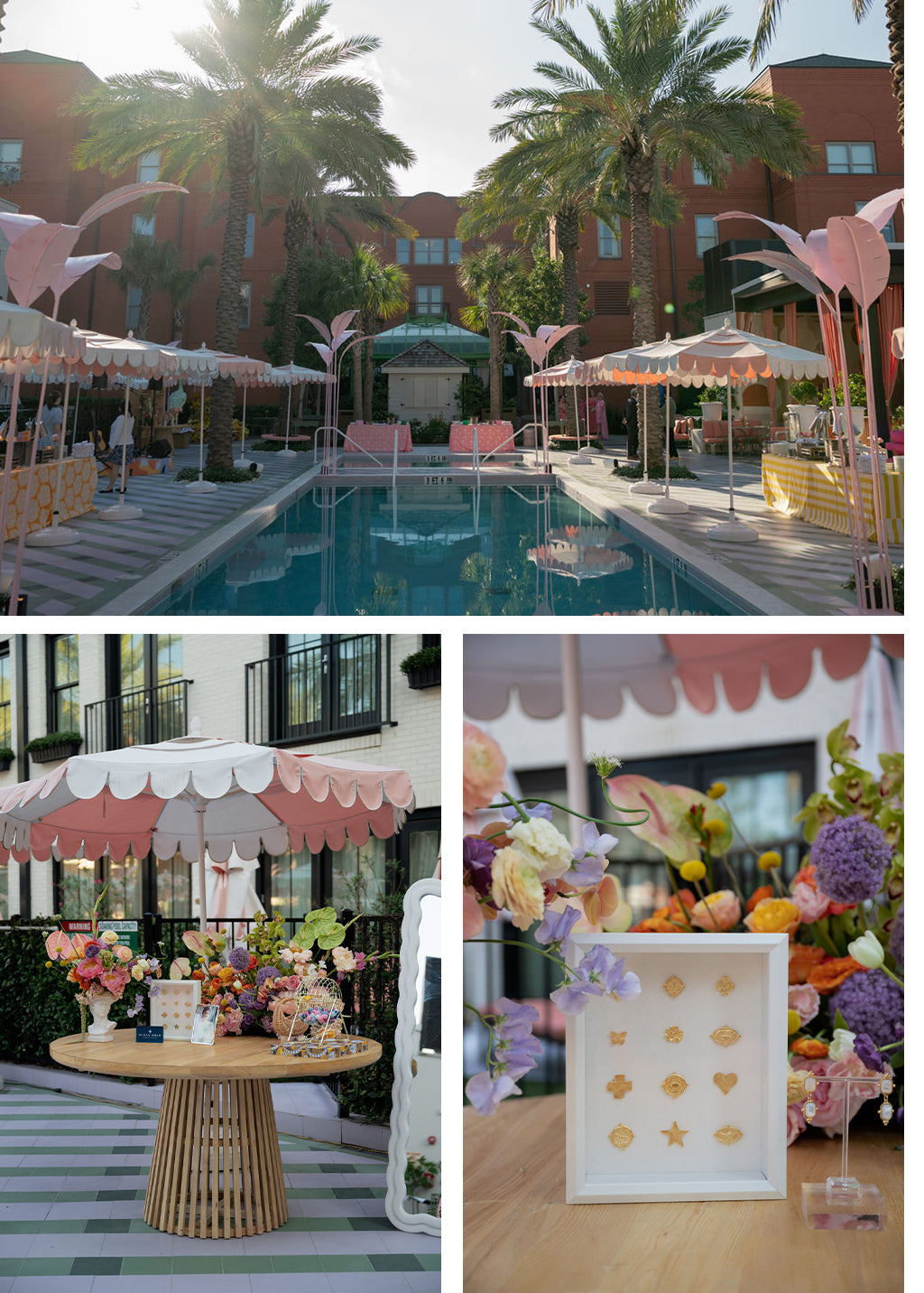 That evening, a grand welcome to Savannah was hosted at Bardo’s glamorous pool deck. Tara Skinner and her team curated every detail, transforming the already fabulous area into a Palm Beach-inspired urban oasis. Poolside cocktails, synchronized swimmers, and bursting florals by Petal Productions completed the scene. We were pleased to gift attendees some of our favorite bridal-inspired styles in a spin-to-win experience just steps from the water’s edge.