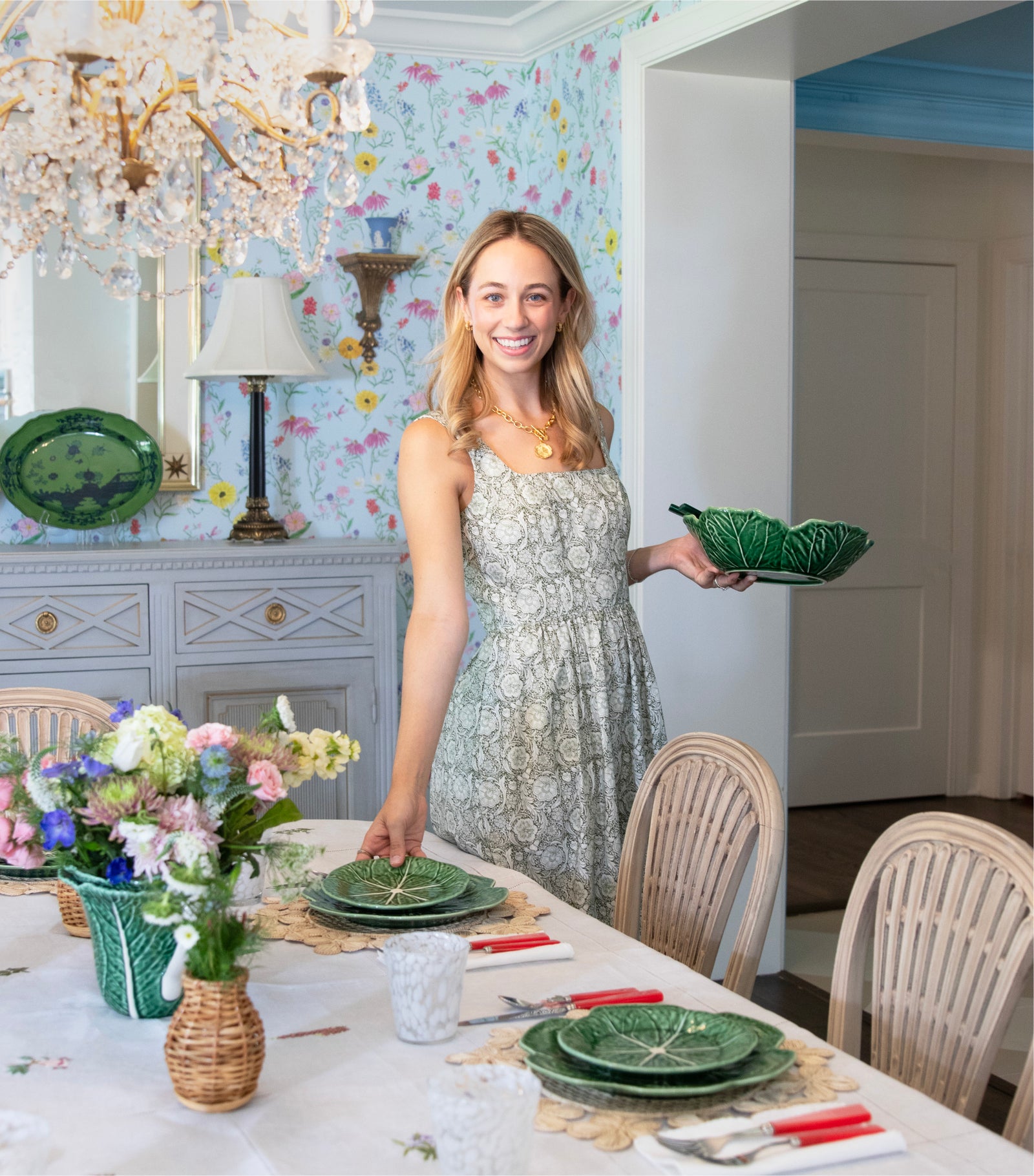 A longtime fan of cabbage dinnerware, San Antonio-based tastemaker Elaina Fagan Darden’s collection is enviable. Step into her home and be instantly transported into a world of cheerful, bright and bold design: just take a peek into her dining room, with walls adorned in wildflowers in a rainbow of colors. The wallpaper is actually Elaina's own design — she works as both an interior designer and textile designer, transforming her watercolor paintings into patterns for the home. Blending traditional style with pops of unexpected, personal elements, we are thrilled to share Elaina's cabbageware-inspired tablescape to celebrate the launch of our new Cabbageware Collection.