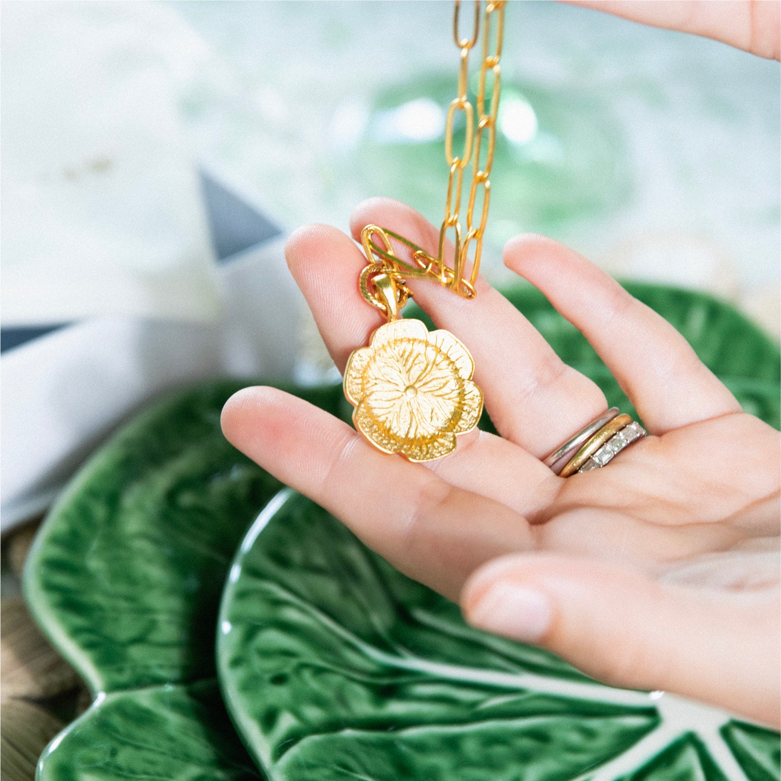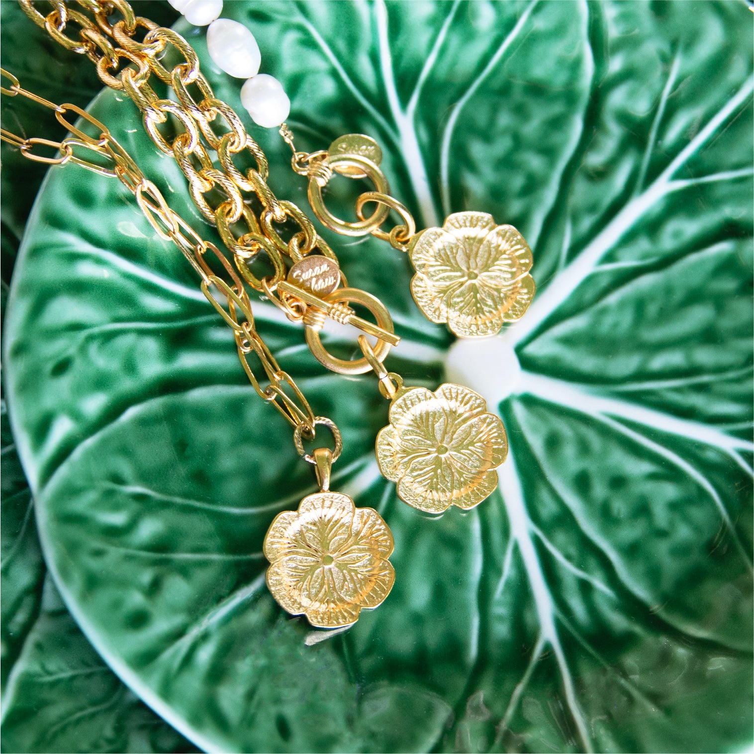 Cabbageware dinner plates have graced the grand tablescapes of icons like Jackie Kennedy Onassis and the Duchess of Windsor. Inspired by this charming array of dinnerware, our Cabbage-inspired pendants were designed after cabbage plates from Susan's personal collection.