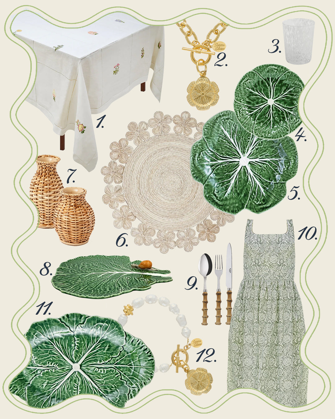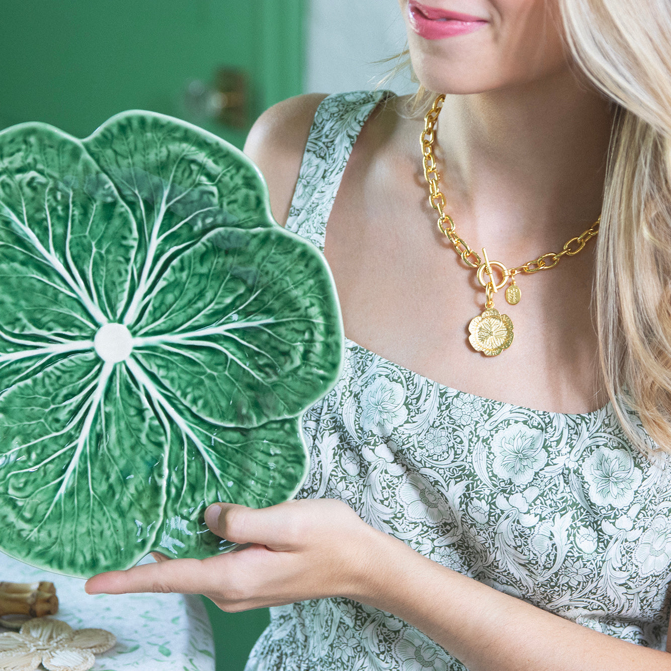 First produced in Europe in the 18th and 19th centuries, the cabbageware we know and love today was popularized by Palm Beach-based ceramicist Dodie Thayer in the 1960s. Icons like Jackie Kennedy Onassis set their grand tablescapes with Thayer's cabbage creations, and her pieces sell at auction for tens of thousands of dollars to this day. With vegetable-inspired varieties now created in colors ranging from pink to classic cabbage-green, our pendants were designed after cabbage plates from Susan's personal collection.