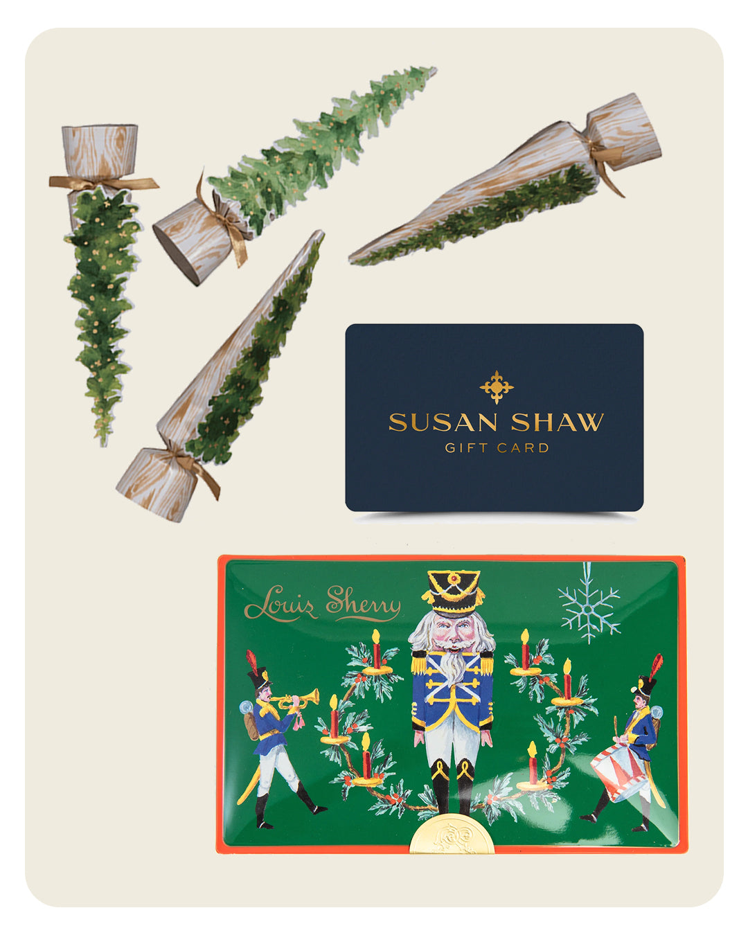 These vintage-inspired Christmas Crackers and Louis Sherry chocolates are great for all ages. And who wouldn't love a Susan Shaw gift card this holiday season?