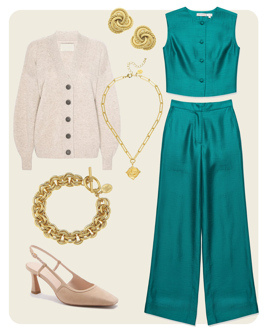 This festive jewel-toned set is balanced by a cozy, oatmeal sweater for wrapping around your shoulders. The Dove Paperclip Necklace adds a meaningful touch to finish off the look.