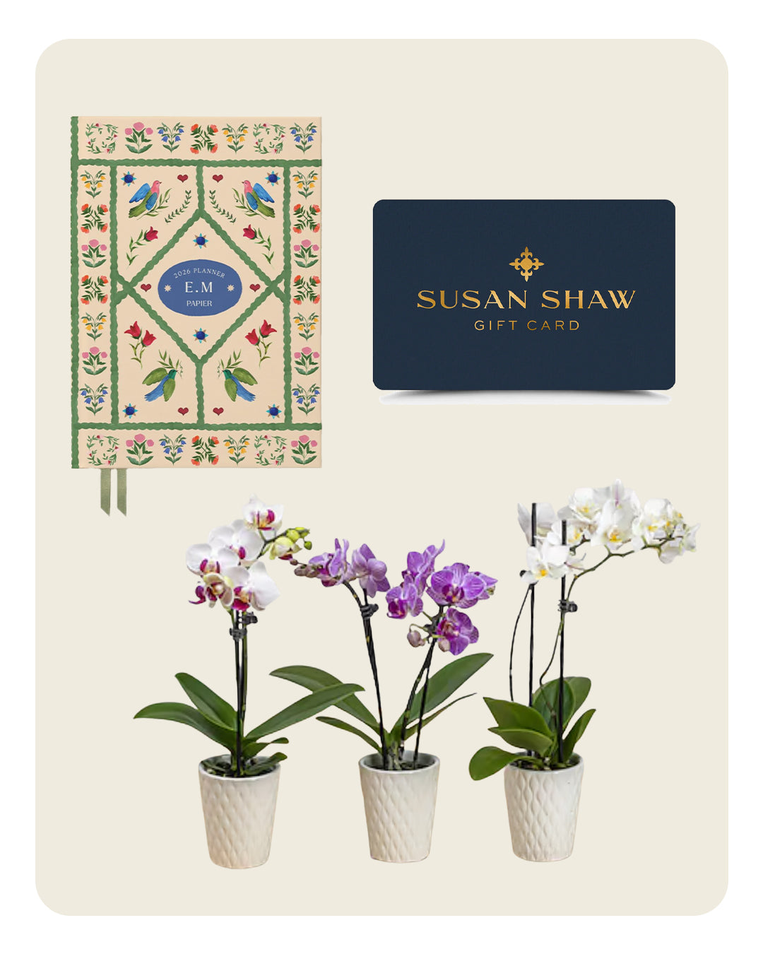 Orchids can symbolize good fortune, health, longevity, harmony, and luck. What a better send-off into the New Year? A beautiful planner with a Susan Shaw gift card tucked inside makes another thoughtful gift.