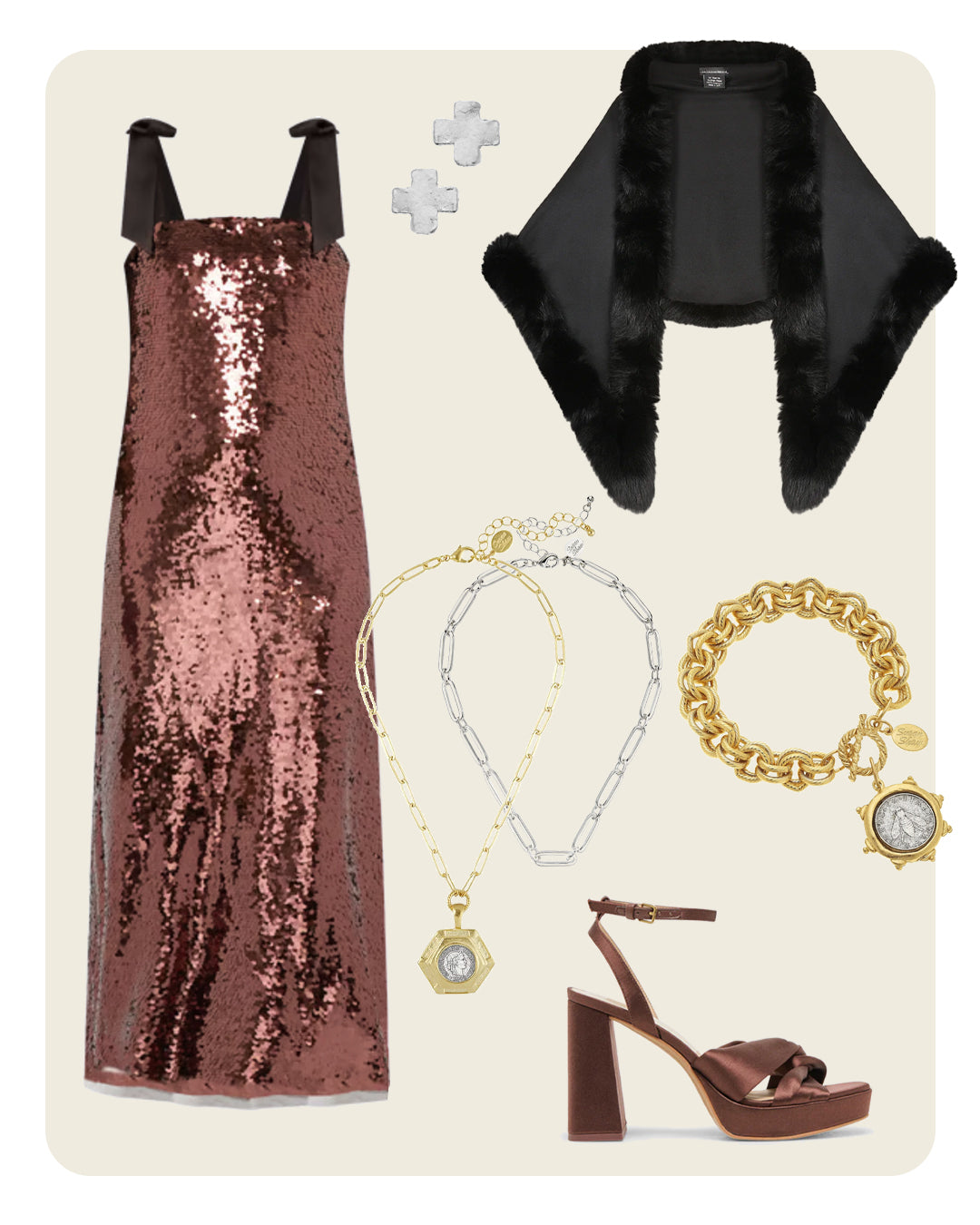This sparkling copper dress is made even more sophisticated with classic, mixed-metal accessories.