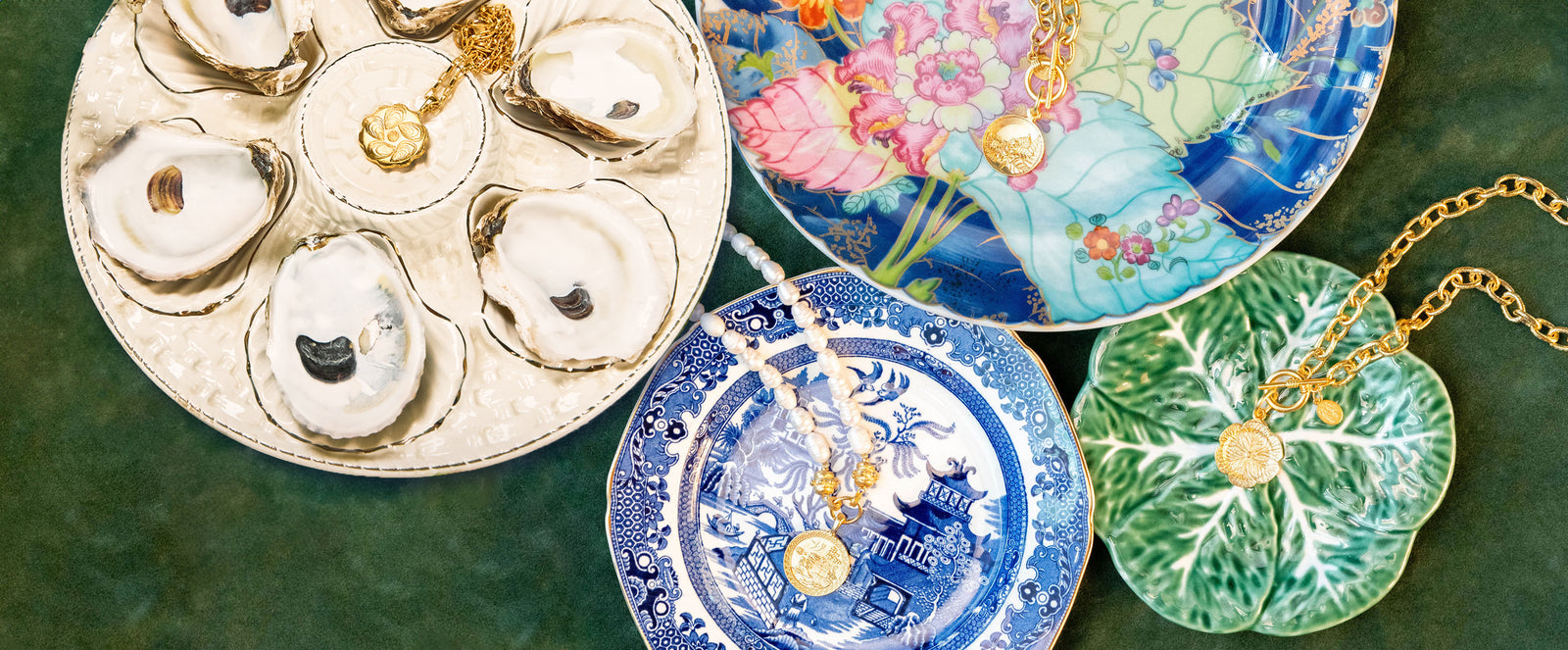 Designed after antique plates from Susan's own collection of dinnerware, including Blue Willow, Tobacco Leaf, Oyster Plates and Cabbageware, these unique jewelry pendants are perfect for the antique-obsessed and hostess extraordinaire.