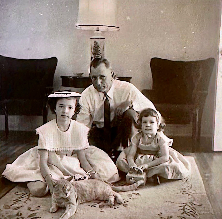 Susan with her father and younger sister, Beverly, at her childhood home in Lockhart, Texas. Oh, how we love her big sailor collar and bonnet. Her cat, Sandy, makes the memory, too! Lockhart, where Susan grew up, is an idyllic Texas town where everyone knows everyone and barbecue is king.