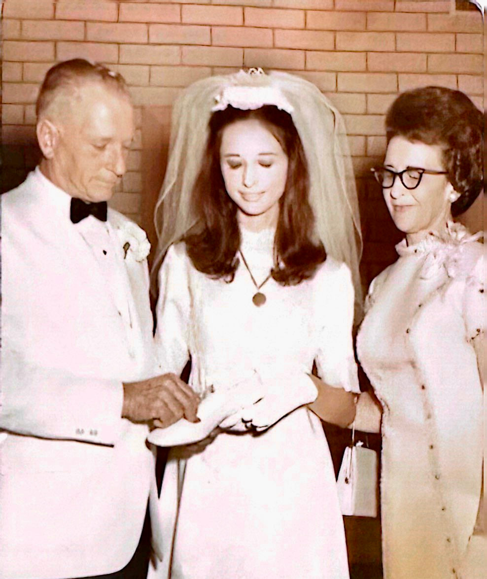 Susan with her parents, Woodrow and Hazel Dunlap, on her wedding day, August 23, 1970.