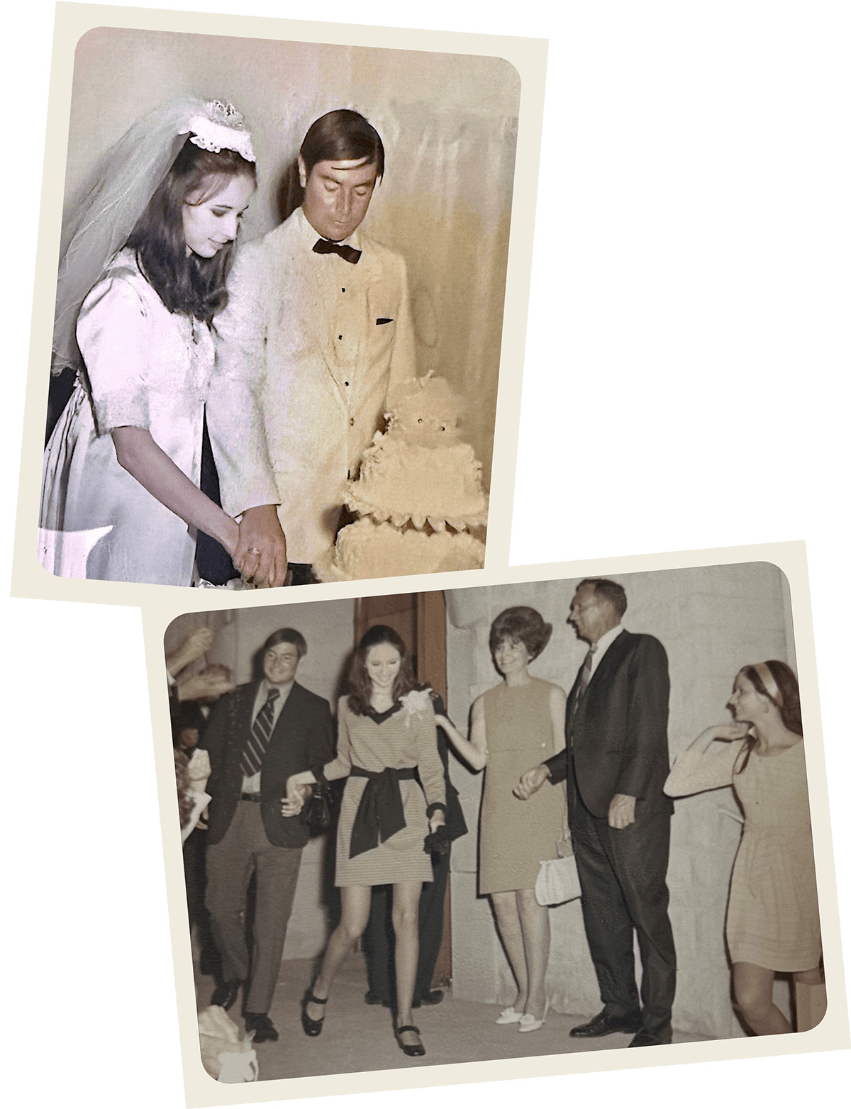 Susan and Eric cut the cake and make their exit on their wedding day, August 23, 1970.