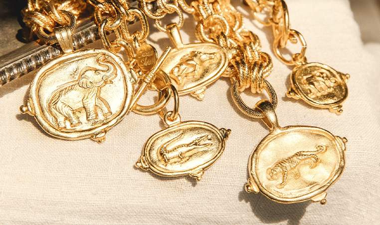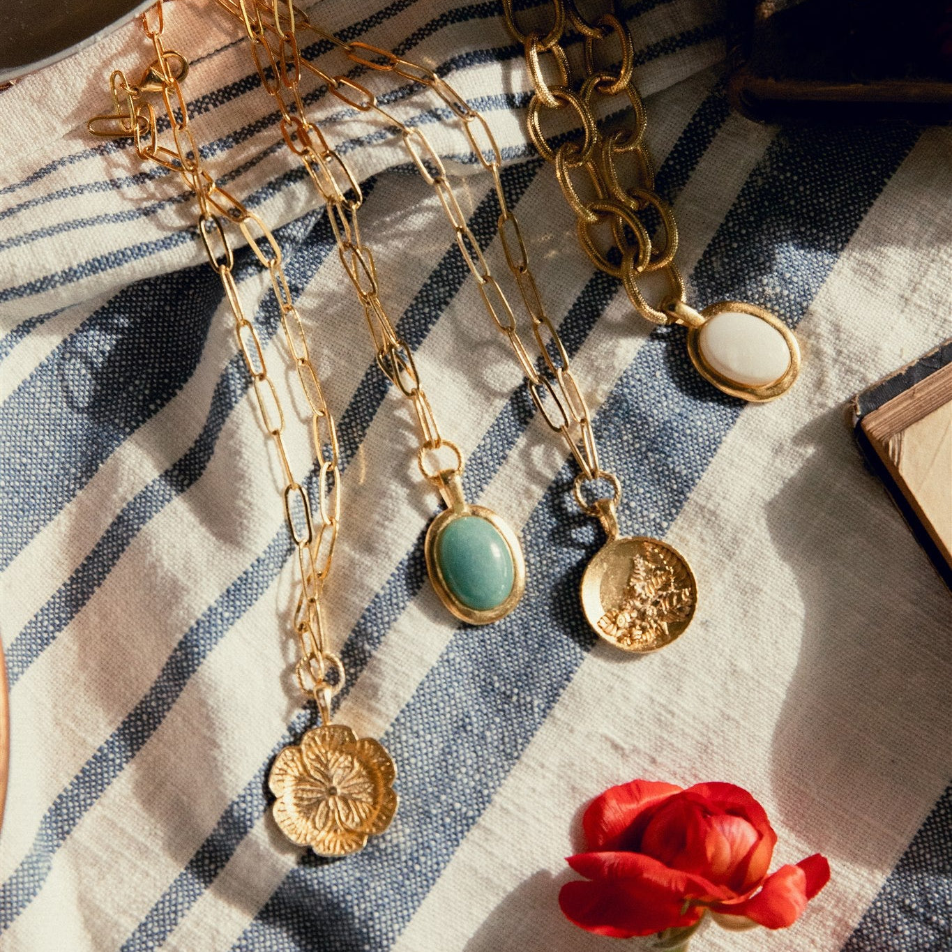 Designed after antique plates from Susan's own collection of dinnerware, including Blue Willow, Tobacco Leaf, Oyster Plates and Cabbageware, these unique jewelry pendants are perfect for the antique-obsessed and hostess extraordinaire.